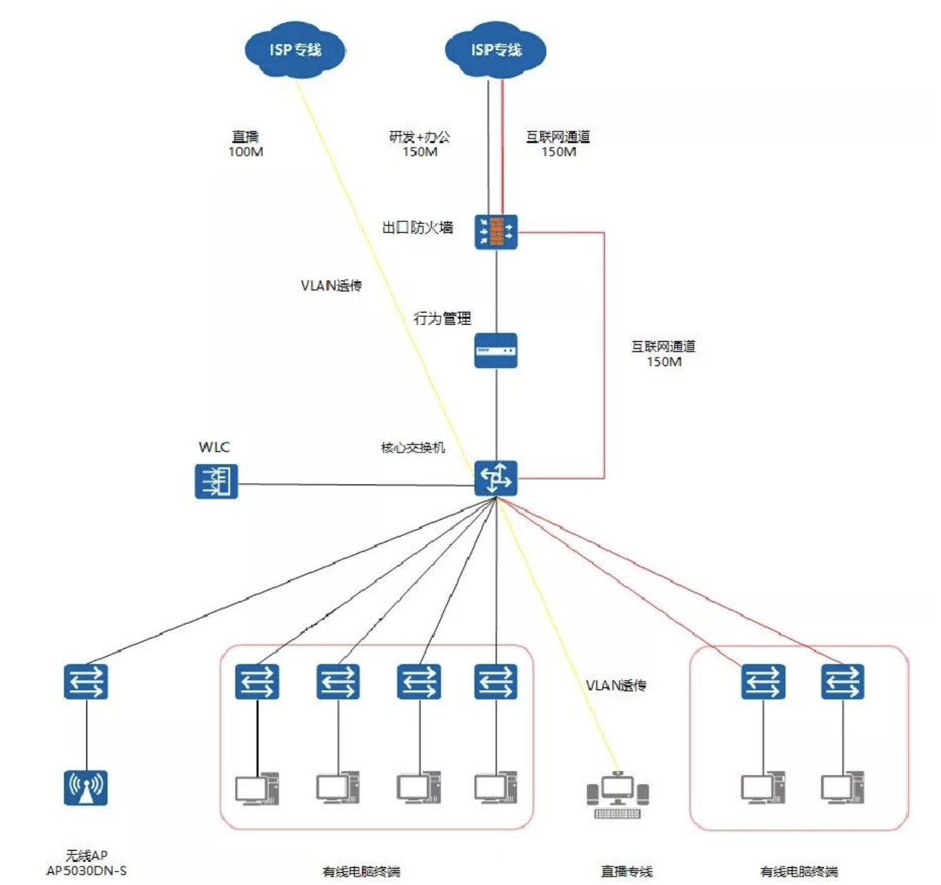 整体网络以有线和无线结合的方式搭建, 有线网络主要用于门禁、监控、视频会议、IP电话等;无线网络用于办公系统软件、教学系统、打印机和移动办公!话不言多, 综合办公网络方案确认好后,工程师便开启高速工作模式。