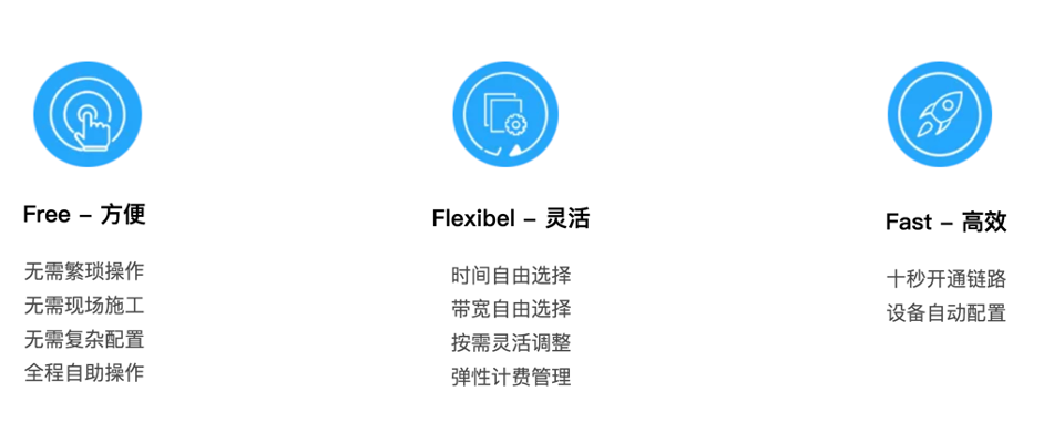 方便灵活 — 自由选择组合带宽、链路质量、时间等参数,按需灵活调整,弹性计费。